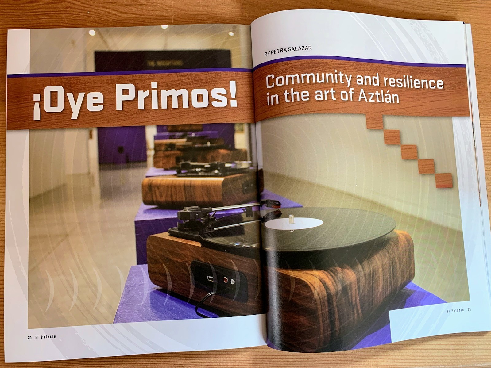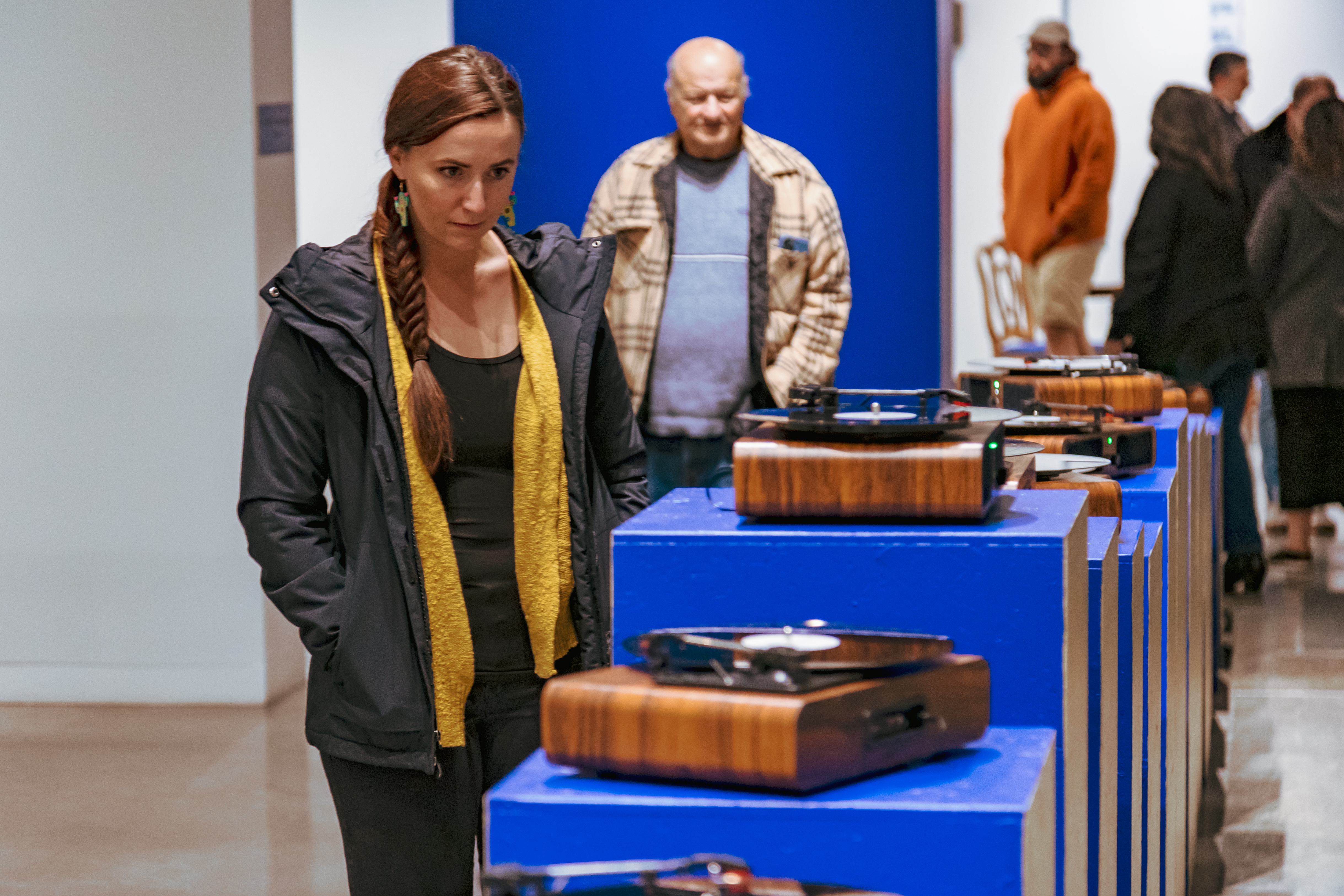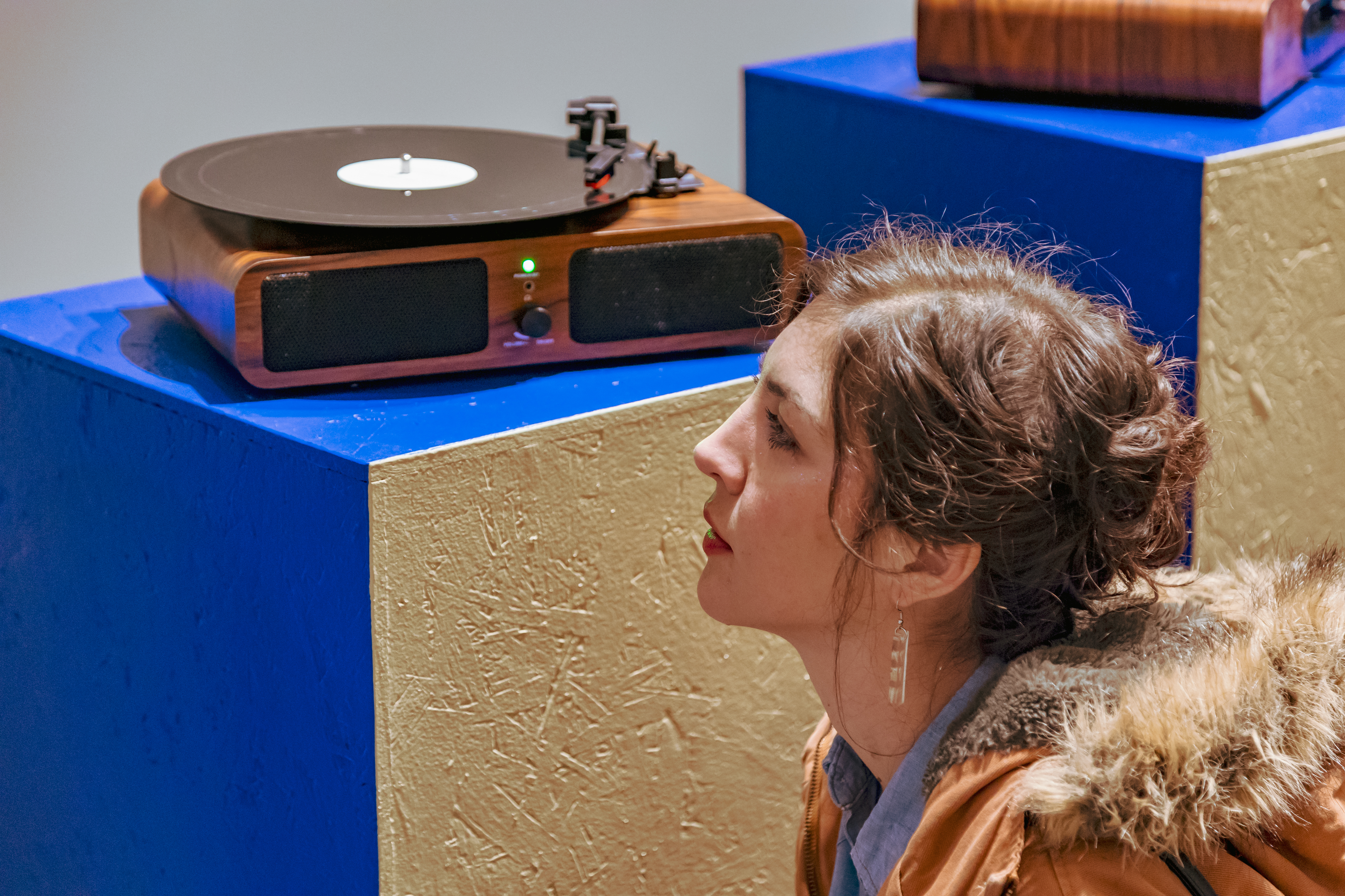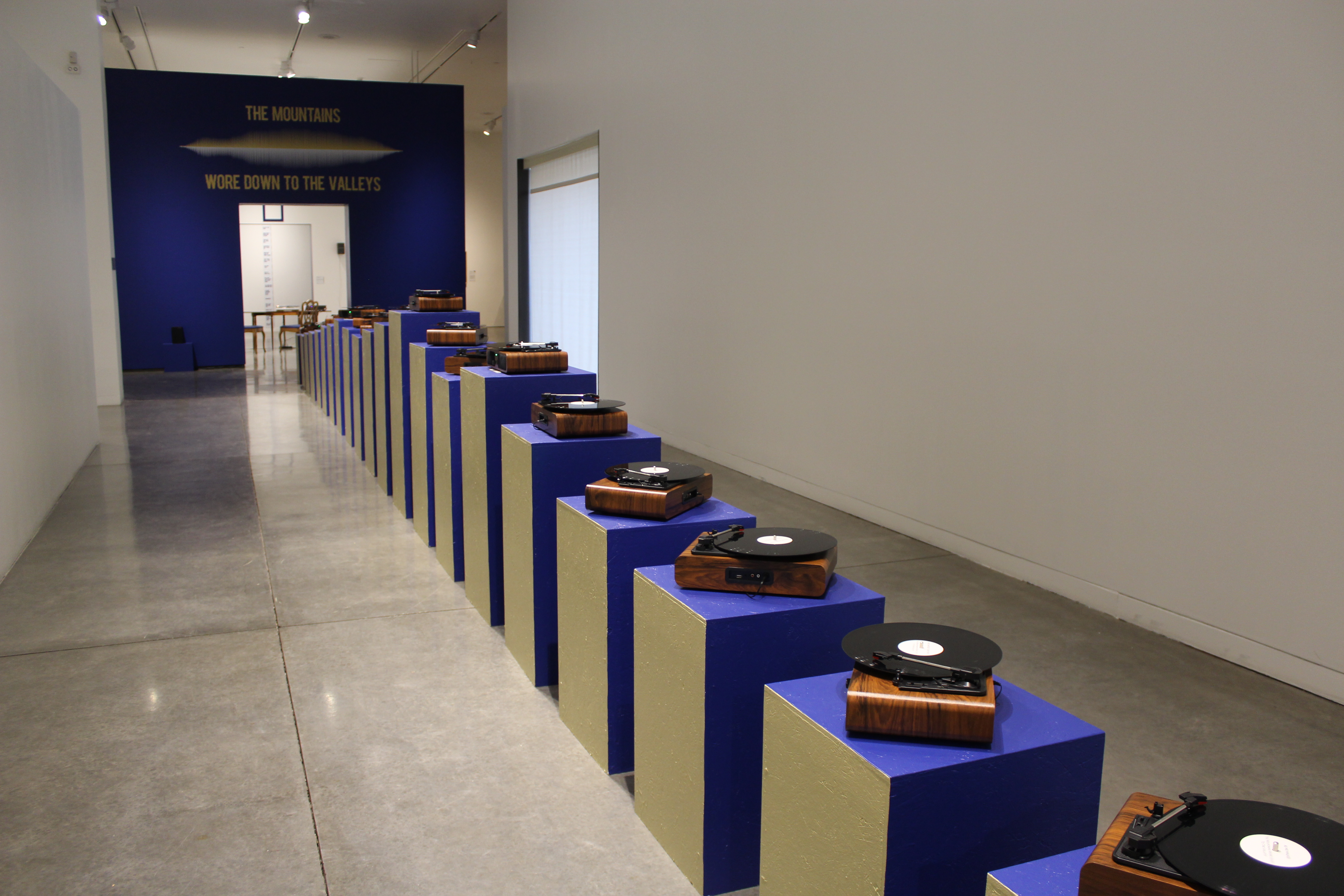 Record players are displayed on pedestals that create a sculptural outline of the Sandia Mountains as seen from Albuquerque, New Mexico De La Cruz’s and Demarco’s hometown.