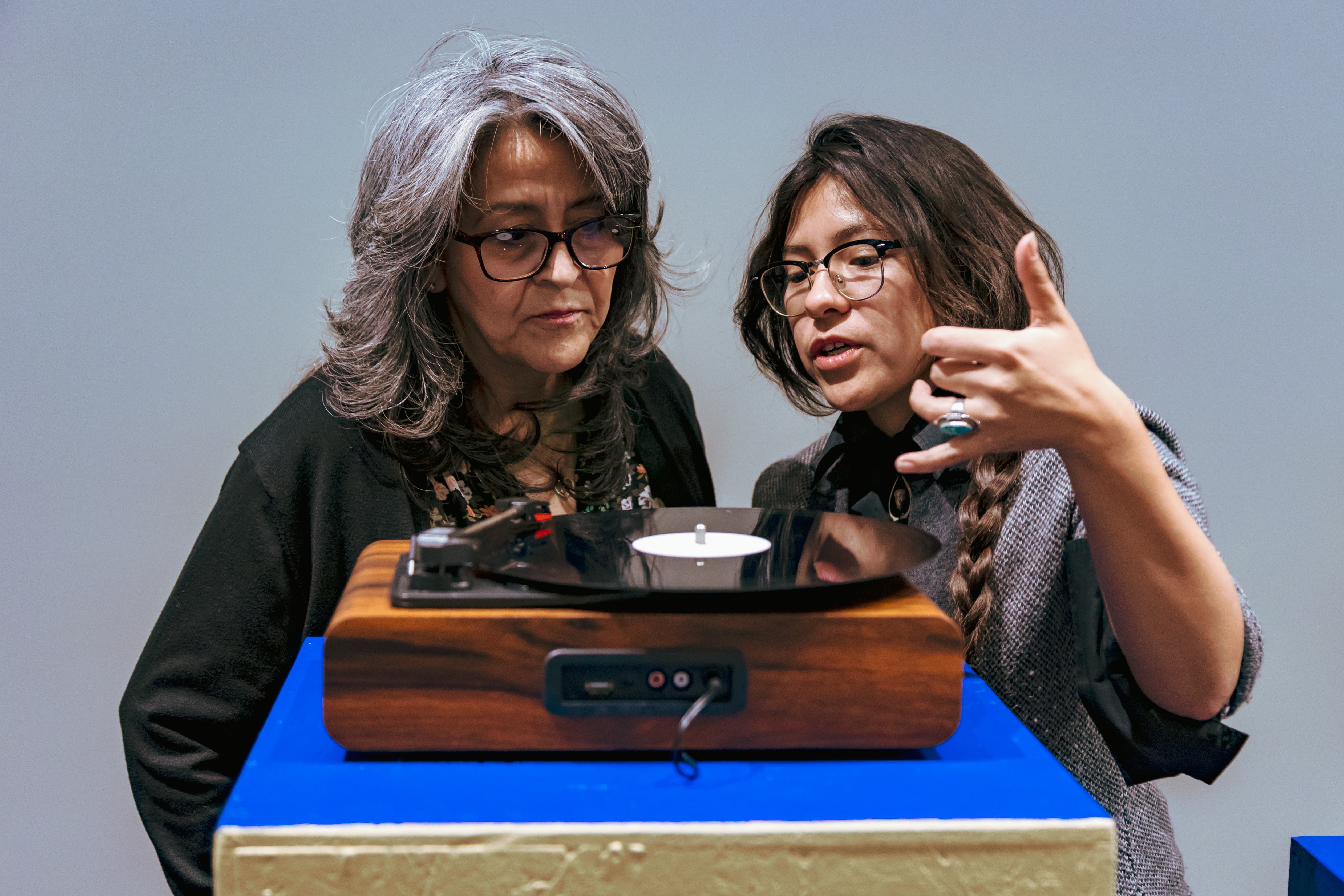 The Mountains Wore Down to the Valleys is a collaborative sound and visual installation by New Mexican artists Adri De La Cruz and Marisa Demarco. The multi-phase exhibition begins and ends with a sound experience that transforms over the course of 72 hours as 21 musical compositions on vinyl records erode over time. A thick etched record features multigenerational interviews with De La Cruz’s family members. This record documents Love, community, generational strength and resiliency. On the unused side of 8 records are hand etched portraits of the interviewees (De La Cruz’s family) that are displayed visually after the 72hrs.